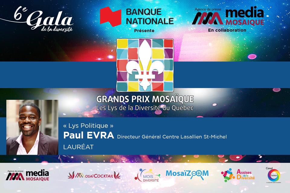 C’est lors du 6e Gala des Lys de la Diversité du Québec qui se déroulait au Théâtre Saint James le 28 mai dernier que M. Paul Evra, s’est vu remettre le Lys Politique décerné par Média Mosaïque Canada à titre Directeur Général du Centre lasallien Saint-Michel qui œuvre à faire rayonner la diversité sous toutes ses formes. Rappelons que l’an dernier c’est Mme Valerie Plante qui a reçu cette distinction.